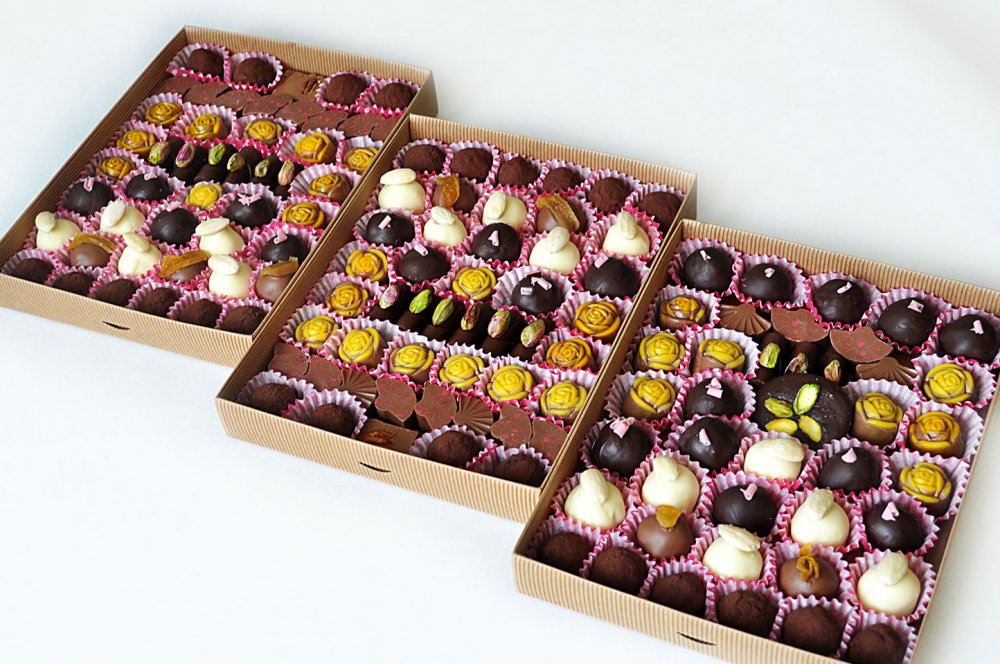 Состав шоколадного набора могут входить конфеты ручной работы из нашего каталога по Вашему выбору: