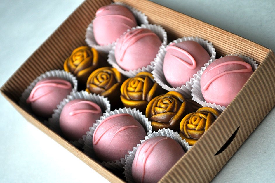 Шоколадный набор конфет с клубничным розовым шоколадом.