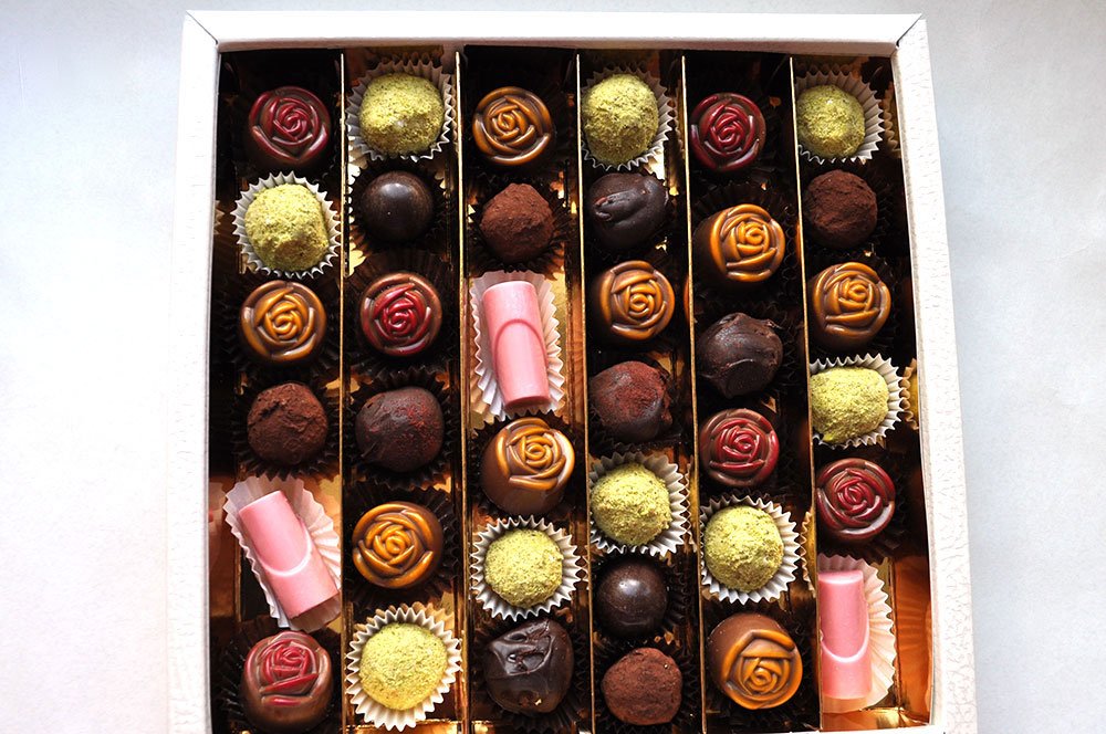 Романтики отыщут в наборе конфеты из бархатистого молочного шоколада. Легкость и летнюю непосредственность подарят клубничные розовые помадки и малиновые трюфели. Темный шоколад, коньяк и грецкий орех не смогут оставить равнодушным ни одного приверженца классических сладостей, а для темпераментных натур мы подготовили лакомства с перчинкой – конфеты из горького шоколада.